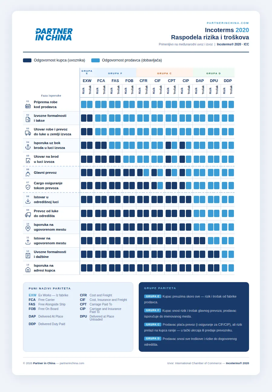 - Rizik prelazi na kupca već u magacinu dobavljača, pre nego što roba krene iz Kine.