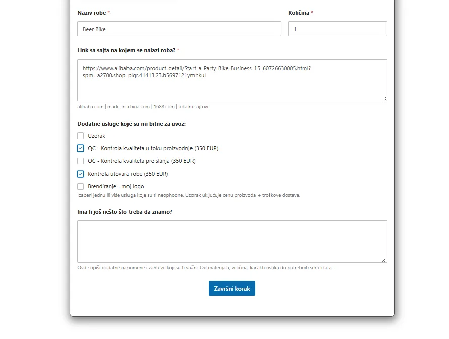 Sa čime se klijenti najčešće susreću: misle da mogu sve sami, jer je Alibaba „laka za korišćenje”. Delimično i jeste tako, nakon nekoliko uspešnih uvoza, veći deo procesa možeš organizovati samostalno. Ali ono što je teško replicirati bez prisustva u Kini, je kontrola kvaliteta, verifikacija dobavljača i rešavanje problema koji nastanu tokom proizvodnje ili nakon isporuke.
